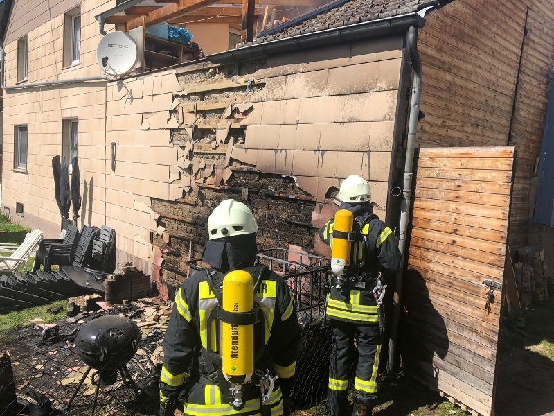 Vor Ort stellte sich heraus, dass die Verkleidung einer Hauswand sowie umliegende Gegenstände in Brand geraten waren, weshalb das Alarmstichwort auf "B2.05 - Nebengebäudebrand" erhöht wurde. Mittels zwei Trupps unter Atemschutz wurde der Brand gelöscht sowie die Verkleidung der Hauswand entfernt, um weitere Glutnester abzulöschen. Die Räumlichkeiten auf der anderen Seite der Hauswand wurden intensiv mittels Wärmebildkamera erkundet, hier konnte glücklicherweise keine Brandausbreitung festgestellt werden.